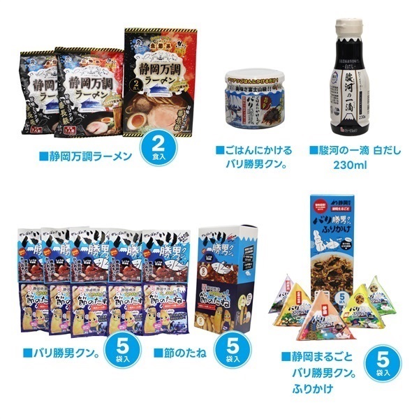 【静岡万調ラーメン】 265g(132.5g(めん80g)×2食) 【バリ勝男クン。】 35g(7g×5袋)・【節のたね】 50g(10g×5袋) 【駿河の一滴 白だし】 230ml×1本 【ごはんにかけるバリ勝男クン。】 80g×1ヶ 【静岡まるごと バリ勝男クン。ふりかけ】 12.5g(2.5g×5袋)