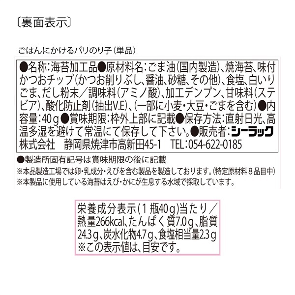 パリパリとした海苔と、ごま油の香ばしい香りに かつおぶしチップスの食感でごはんが進みます。