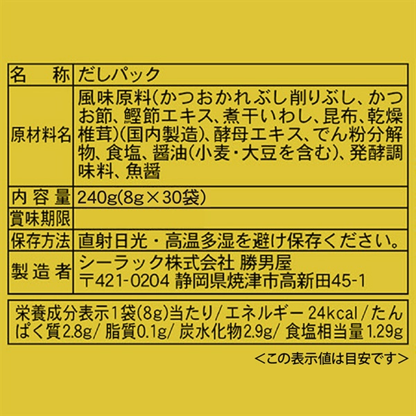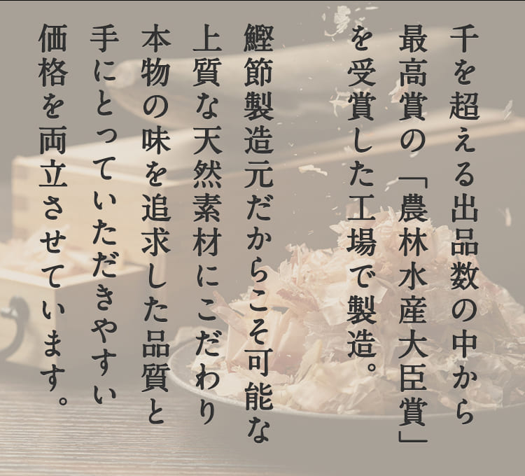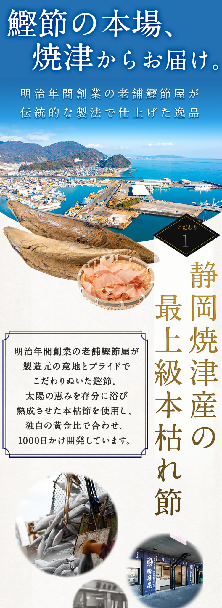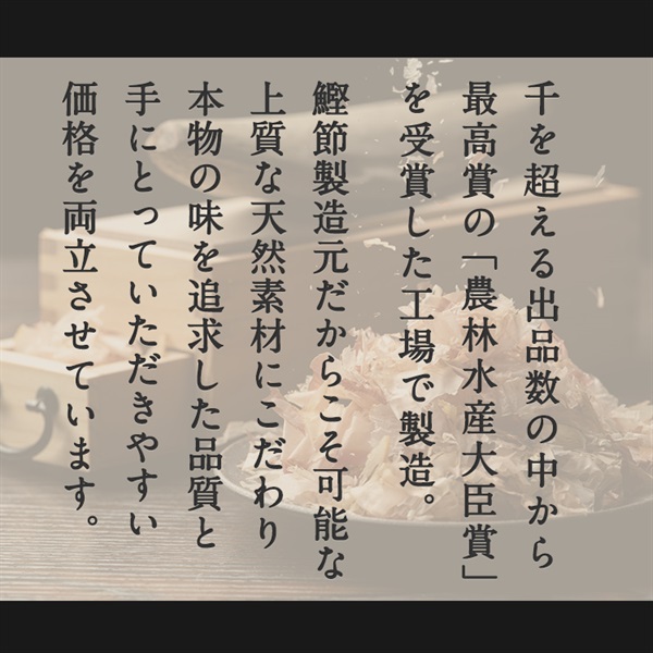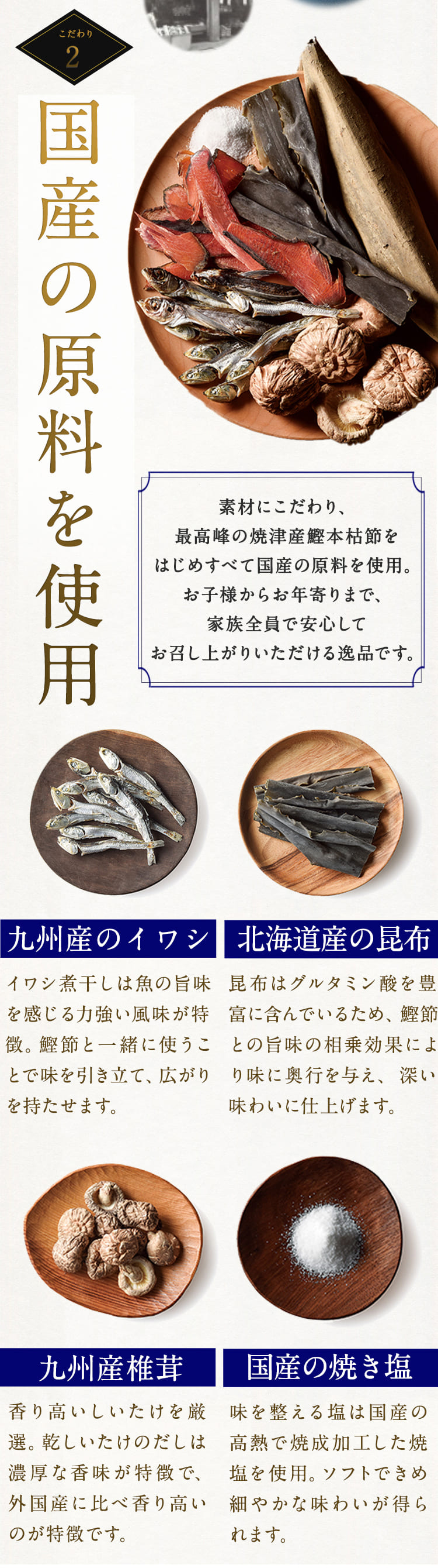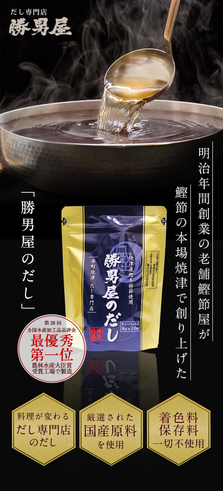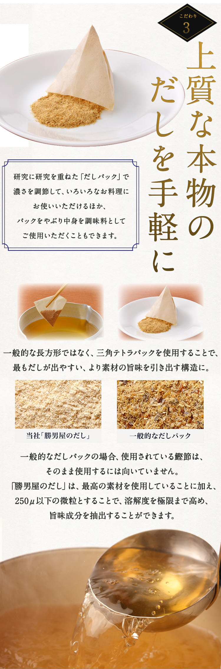 明治年間創業の老舗鰹節屋が、意地とプライドを賭け創り上げた水産庁長官賞・連合会会長賞受賞の本物のだしを味わっていただけるだしパックです。 素材にこだわり、最高峰の焼津産鰹本枯節をはじめ、すべて国産の原料を使用しているので安心してお召し上がりいただける逸品です。 濃さを調節して、いろいろなお料理にお使いいただけるほか、パックをやぶって中身をそのまま調味料としてご使用いただくこともできます。