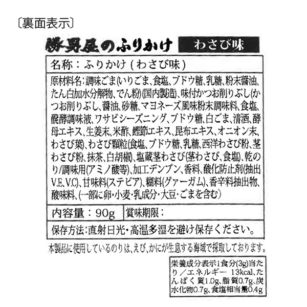 原材料名:調味ごま(いりごま、食塩、ブドウ糖、乳糖、粉末醤油、たん白加水分解物、でん粉)(国内製造)、味付かつお削りぶし(かつお削りぶし、醤油、砂糖、マヨネーズ風味粉末調味料、食塩、醗酵調味液、ワサビシーズニング、ブドウ糖、白ごま、清酒、酵母エキス、生姜末、米酢、鰹節エキス、昆布エキス、オニオン末、わさび葉)、わさび顆粒(食塩、ブドウ糖、乳糖、西洋わさび粉、茎わさび粉、抹茶、白胡椒)、塩蔵茎わさび(茎わさび、食塩)、乾のり/調味用(アミノ酸等)、加工デンプン、香料、酸化防止剤(抽出V.E、V.C)、甘味料(ステビア)、糊料(グァーガム)、香辛料抽出物、酸味料、(一部に卵・小麦・乳成分・大豆・ごまを含む)