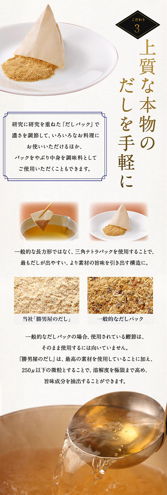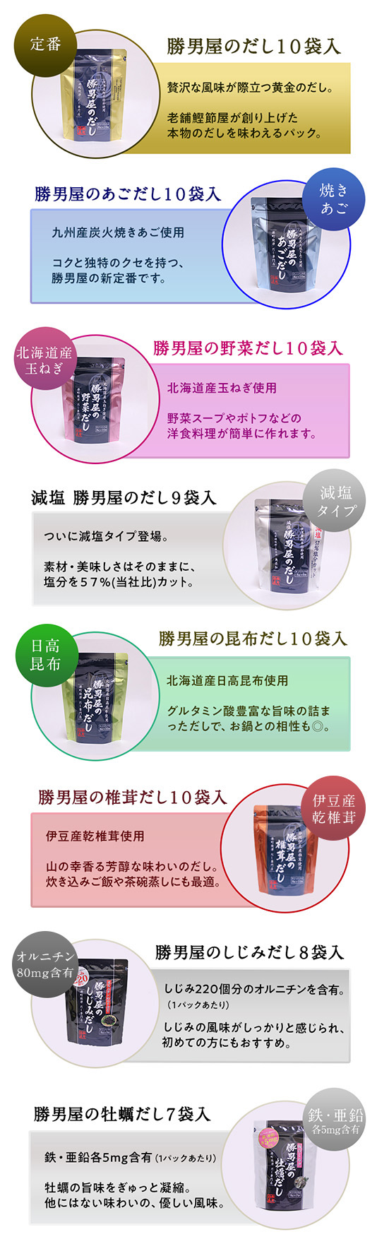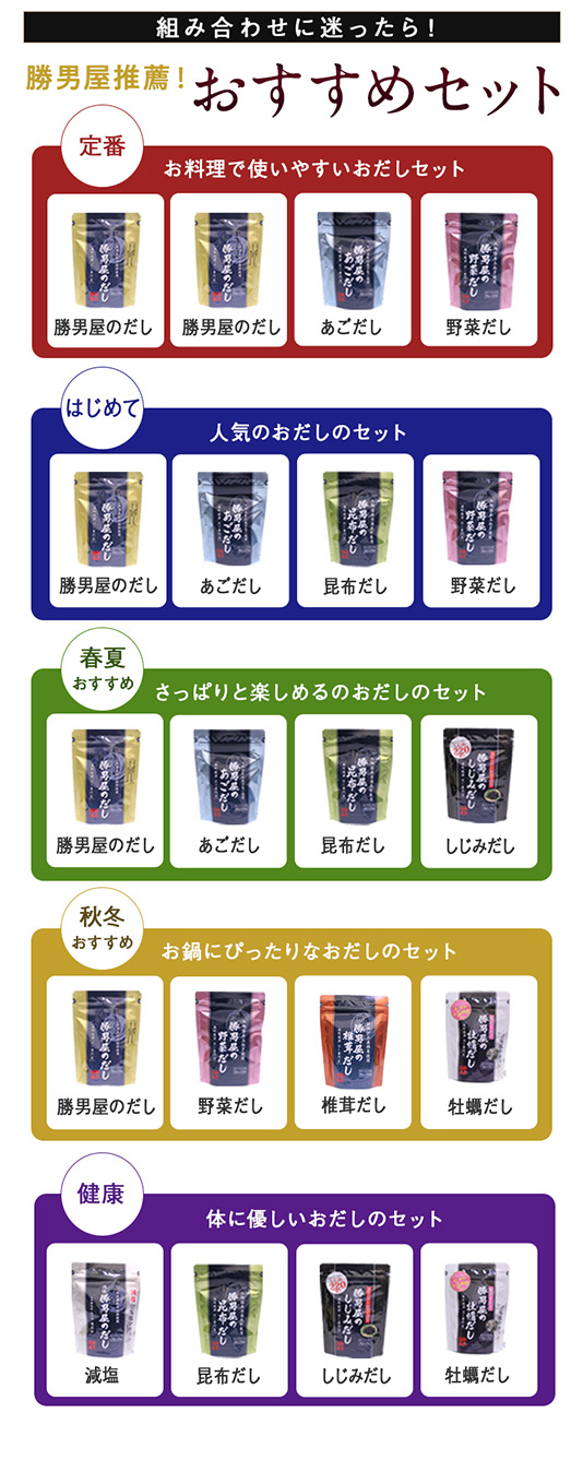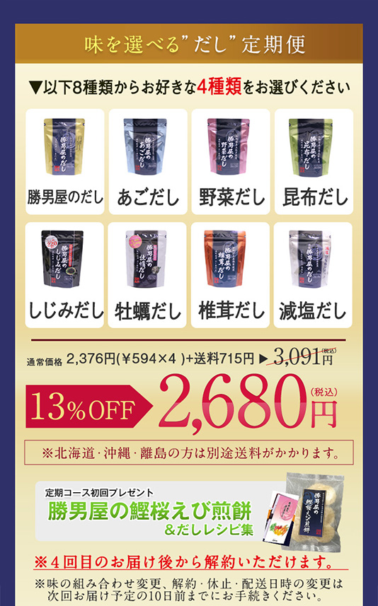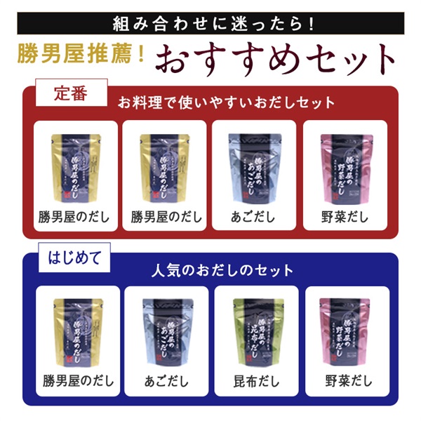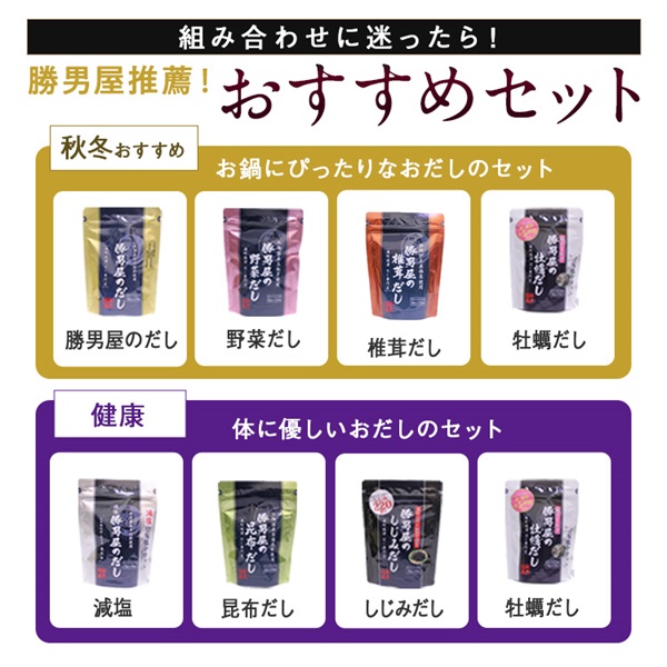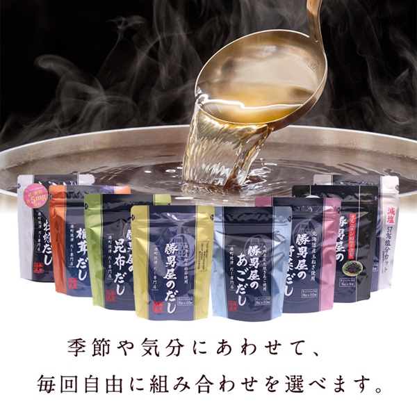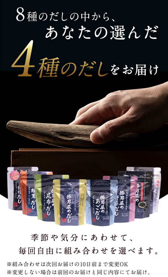 勝男屋のだし・あごだし・野菜だし・昆布だし・しじみだし・牡蠣だし・椎茸だし・減塩だしの8種類の中からお好きな4種類を選んで、毎回お得に購入できる定期便です。